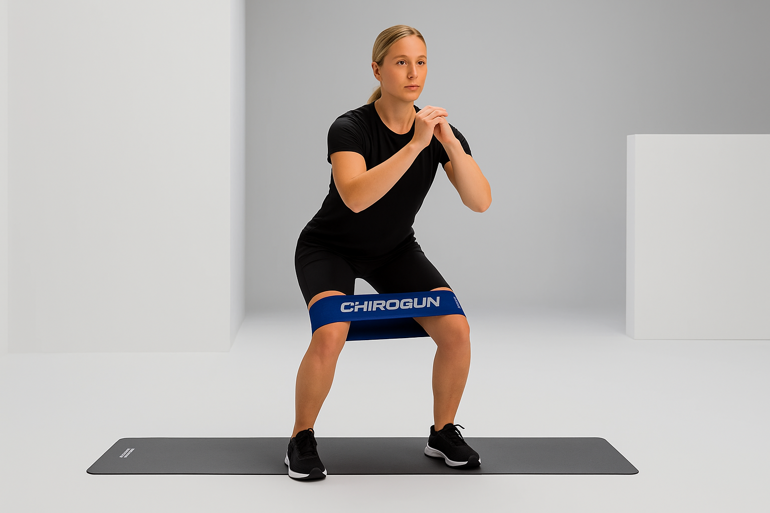 Nutze die BĂ€nder zur Aktivierung deiner Bein- und HĂŒftmuskulatur. Ein effektives Warm-up ist der seitliche Bandwalk: Band knapp ĂŒber die Knöchel, leicht in die Knie gehen und kontrollierte Seitenschritte ausfĂŒhren. So wird der Gluteus medius gezielt aktiviert und sorgt fĂŒr mehr StabilitĂ€t im Training.